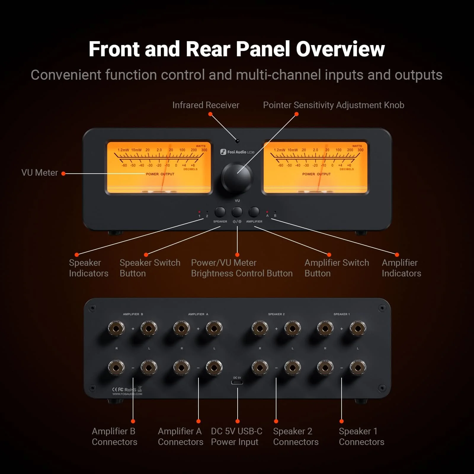 Fosi Audio kõlarite kommutaator ja VU meeter. Mitu võimendite tugi, 250W/kanal