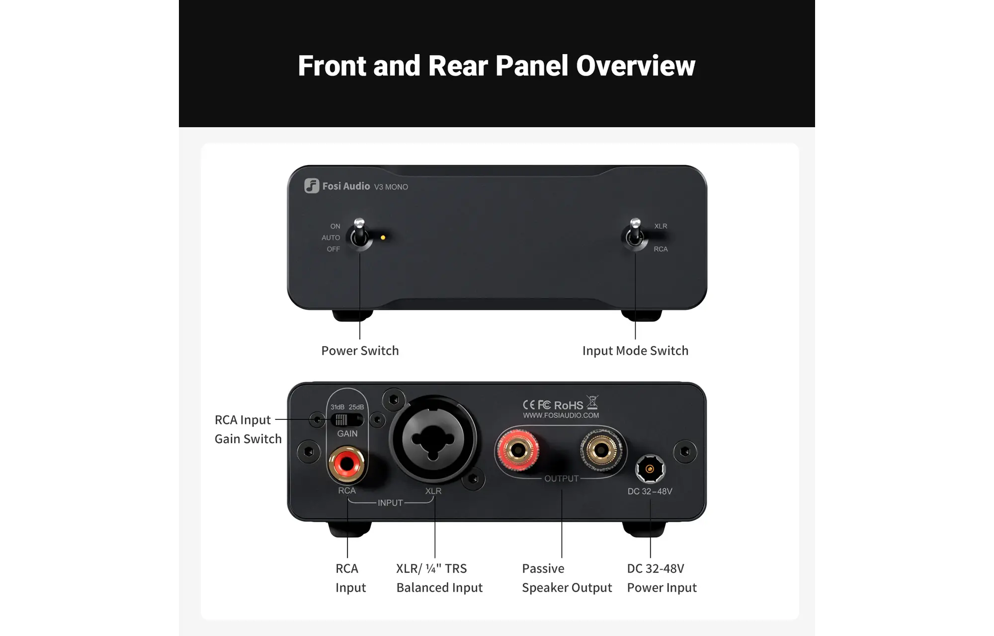 - Gain : XLR/¼” TRS: 20dB ; RCA: 19dB, 25dB
