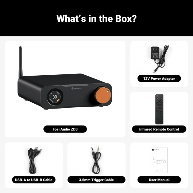 - Komplektis: DAC konverter, toiteadapter (12V), kasutusjuhend, IR pult, USB-A – USB-B kaabel, 3.5mm Trigger kaabel