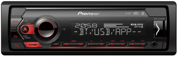 USB/AUX/BLUETOOTH/DAB+ autoraadio, võimsus: MOSFET 4 x 50W, 1 x RCA paar tagaküljel, punane nuppude valgustus