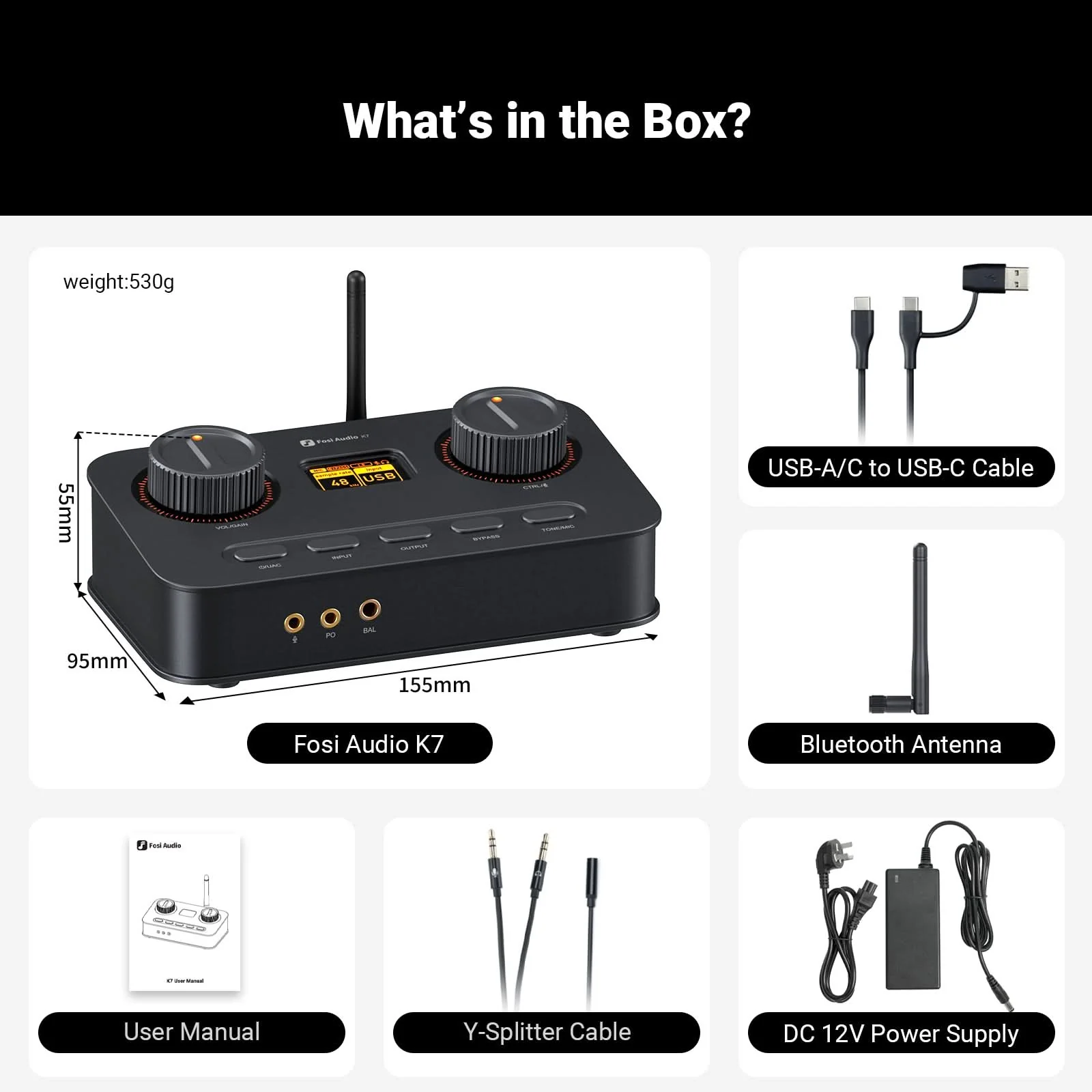 - Komplektis: DAC eelvõimendi, USB-A/C — USB-C kaabel, Bluetooth antenn, Y-splitter kaabel, kasutusjuhend, toiteadapter (12V)